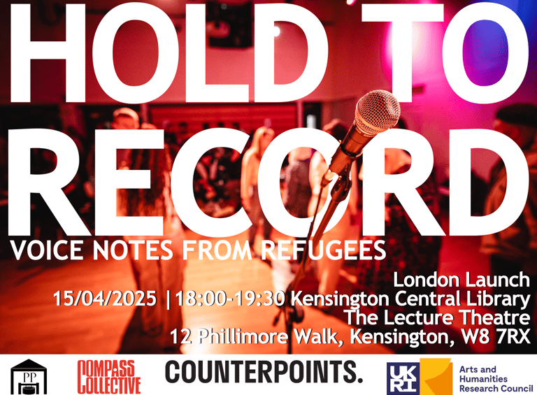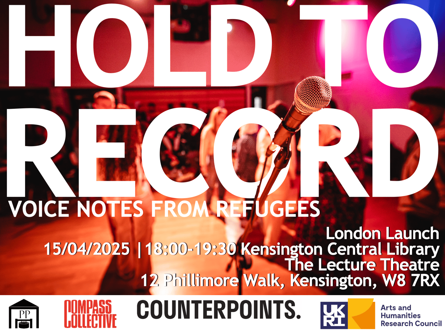 Palewell Press and the Kensington Central Library present the launch of Hold to Record: Voice Notes from Refugees. The anthology features messages from 12 refugees and asylum seekers from around the world and offers new ways to think about displaced voices, creative networks and different modes of talking and listening across cultures.