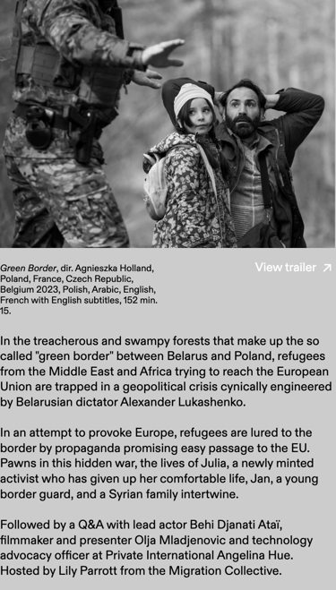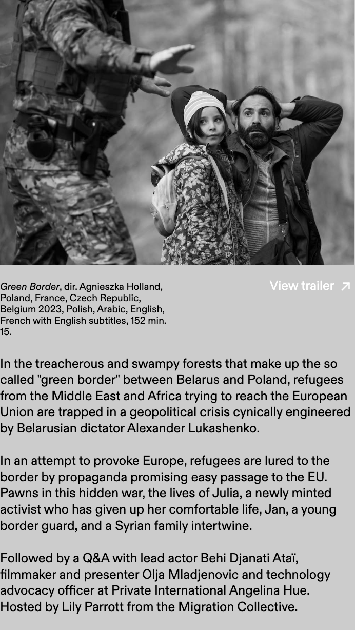 I appeared in a post-screening Q&A for Green Border, directed by Agnieszka Holland. The discussion followed the screening of the powerful feature exploring the humanitarian crisis at the Belarus–Poland border. I joined lead actor Behi Djanati Ataï and Angelina Hue of Privacy International for a conversation on migration, geopolitics and representation, hosted by Lily Parrott from the Migration Collective.