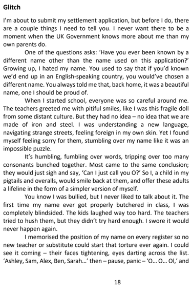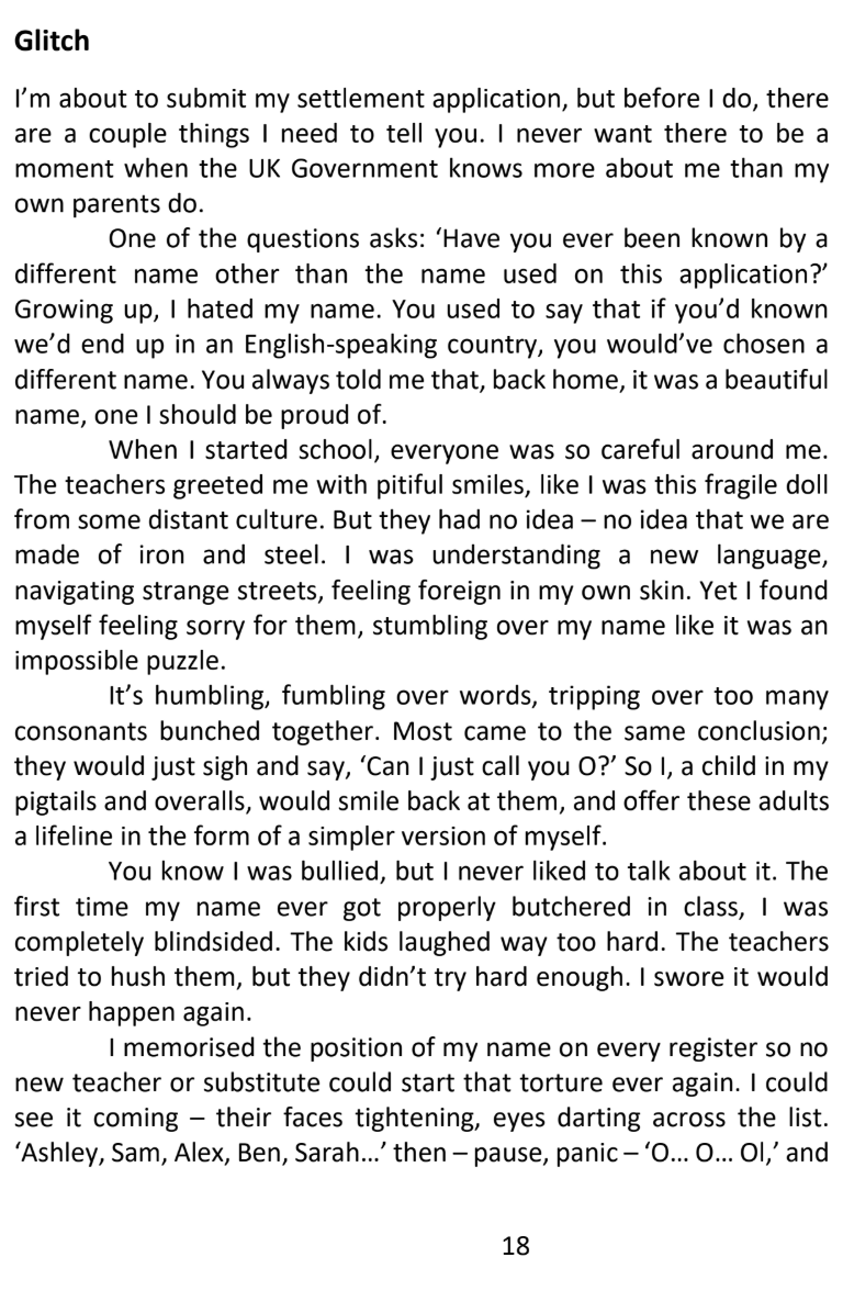 Extract from Glitch from the anthology Hold to Record: Voice Notes from Refugees, off the back of the Voice Notes project following the international exhibition. Framed as a voice note to my parents on the eve of submitting my settlement application, the piece explores names, assimilation and the fracture between inherited and chosen identity.