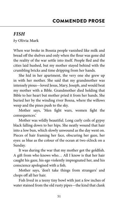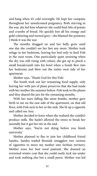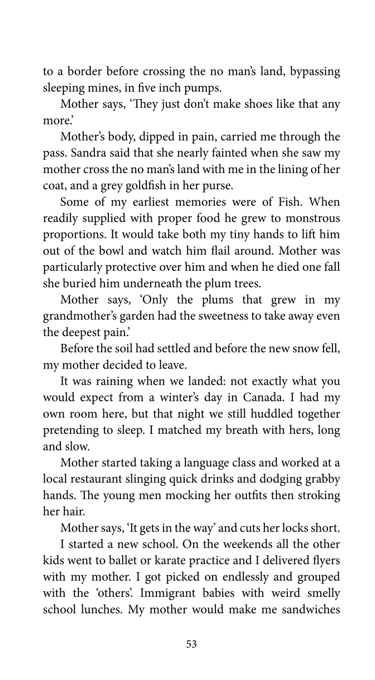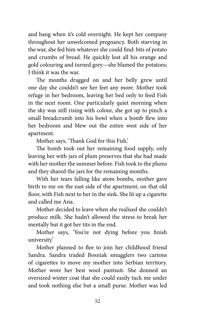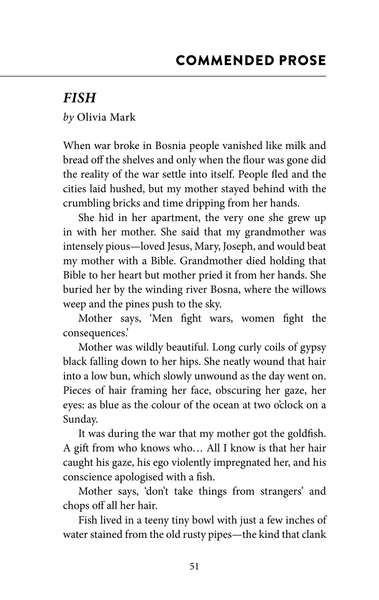 Creative Futures Award winning short story. A lyrical, darkly humorous exploration of war, migration and what women inherit, told through a daughter piecing together her mother’s survival, crossing minefields in heels with a newborn hidden in her coat and a goldfish in her pocket